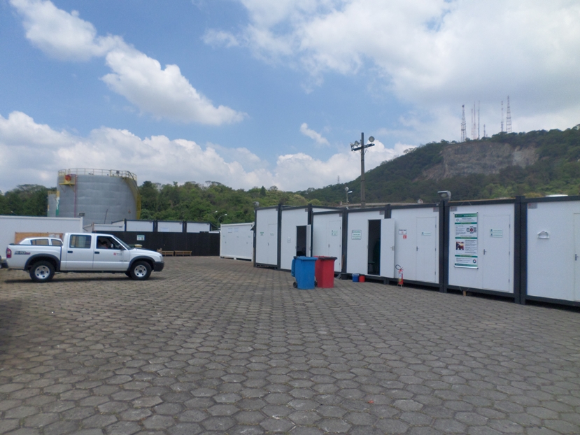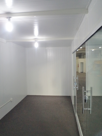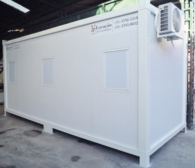 Containers escritório c/banheiro para obras civis, construção pesada e diversos fins. Feito com painéis termo-isolantes com chapas de aço nas duas faces, pintura primer epoxi e miolo em EPS. Piso em madeira naval com revestimento vinílico. Elétrica com tomadas, luminárias e ar condicionado tipo Split. Janelas máximo ar em alumínio anodizado branco. Banheiro com vaso c/caixa acoplada, lavatório e exaustor. Estrutura robusta em aço com pintura automotiva.