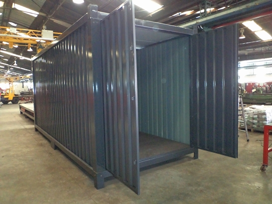 Containers fabricados desmontáveis para almoxarifado e guarda de materiais ou equipamentos. Container em chapa lambri com porta em duas folhas com abertura total.